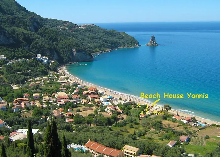 Situated along the stunning coastline of Agios Gordios Beach on Corfu, Beach House Yannis offers an idyllic seaside retreat for families and adventure seekers alike. Just a kilometer from the tranquil Pentati Beach, this vacation haven consists of four charming cottages spread across a generous expanse of lush grounds. Each cottage is designed with comfort in mind and features air-conditioned accommodations, ensuring a serene and refreshing stay.